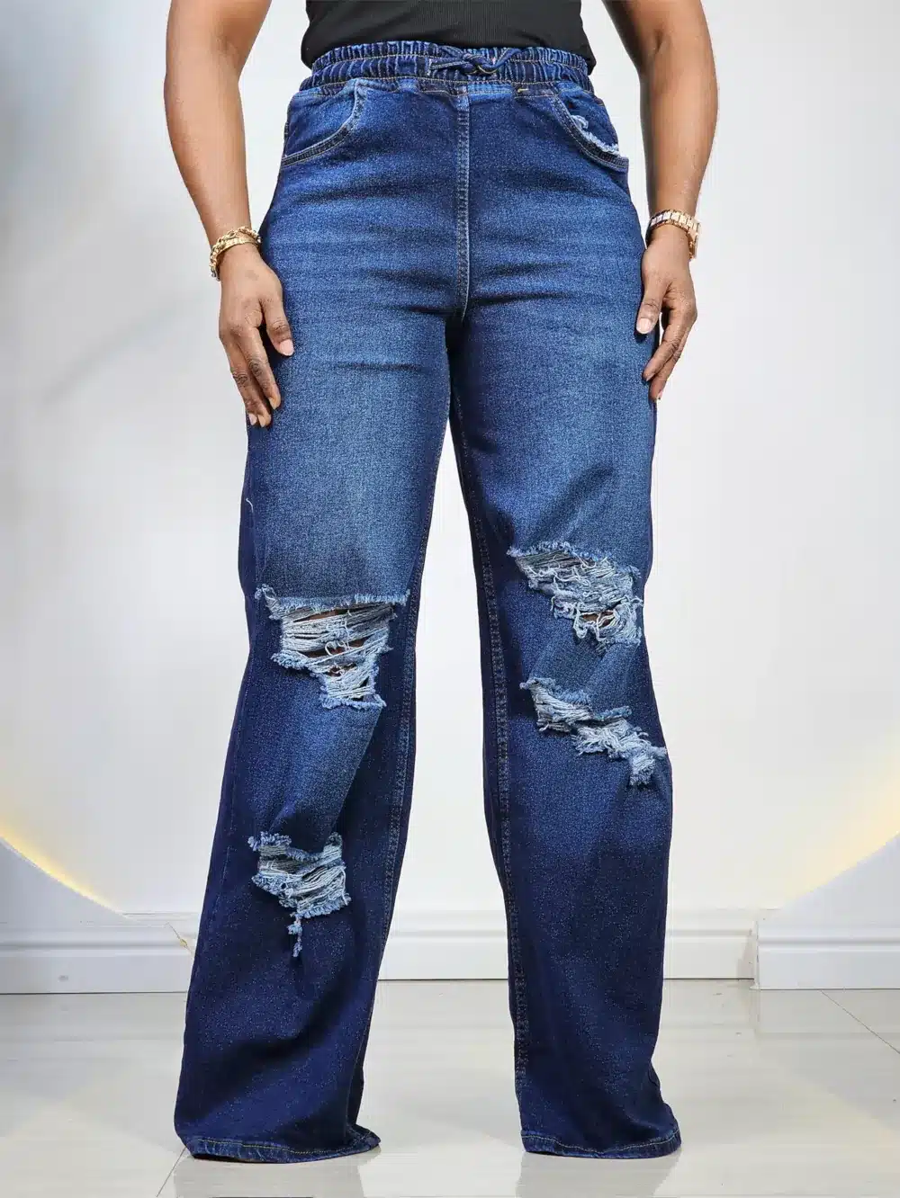 ELASTIC WAIST KNEE RIPPED PALAZZO MOM JEANS