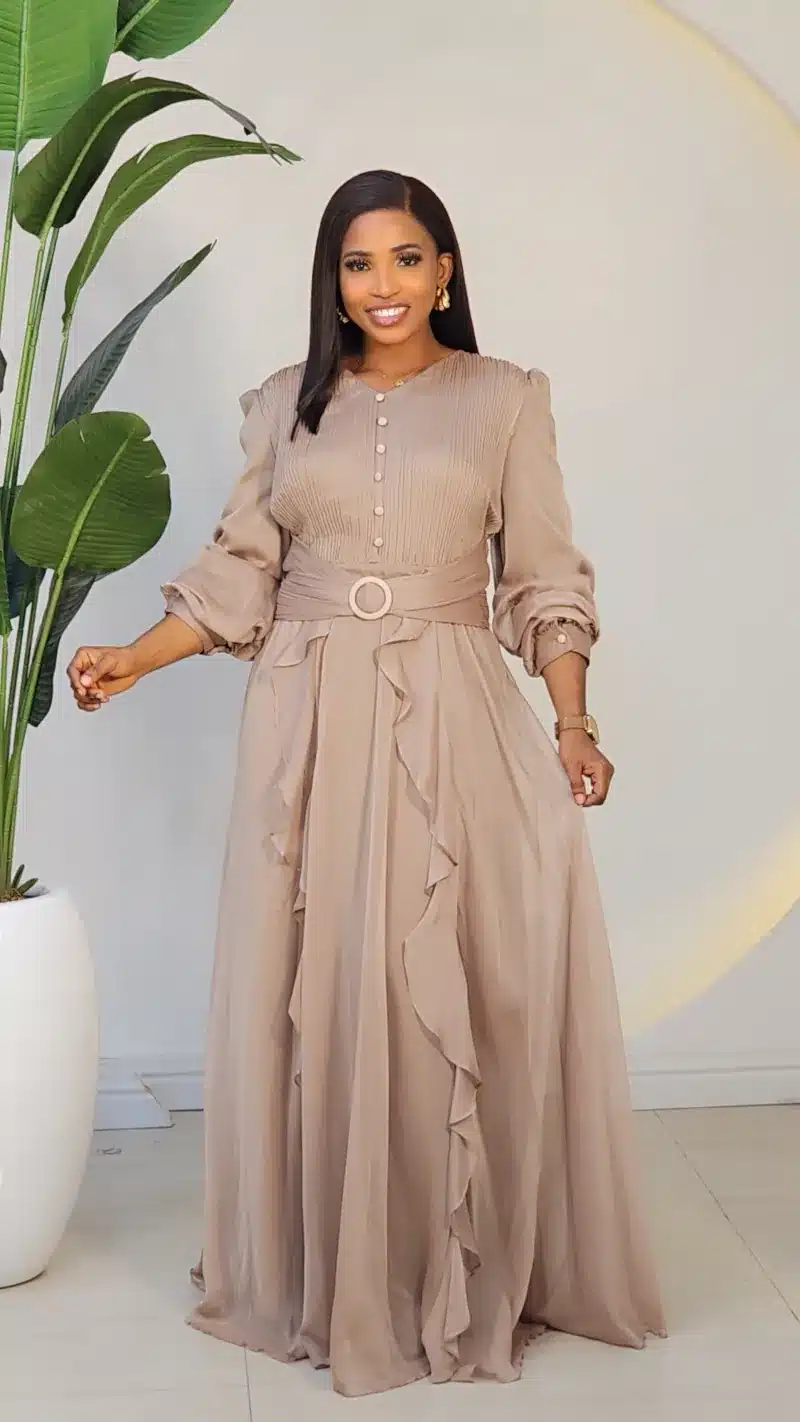 PLEAT CHEST RUFFLE FRONT MAXI DRESS