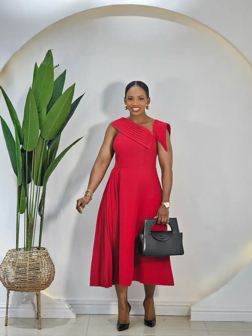 SIDE PLEAT ONE SLEEVE OFF SHOULDER DRESS